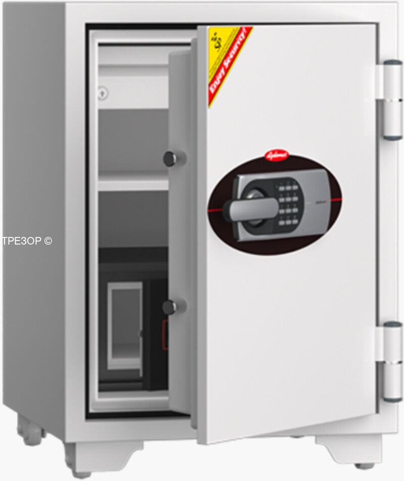 Огнестойкий гибридный дата-сейф Diplomat 070DE. Предназначен для совместного хранения бумажных документов и информационных носителей. Сертифицирован по классам 90P / 90DIS. Внутреннее оснащение: 1 полка, запираемое отделение, дата вставка (104х275х231). Корпус окрашен в RAL 9002.