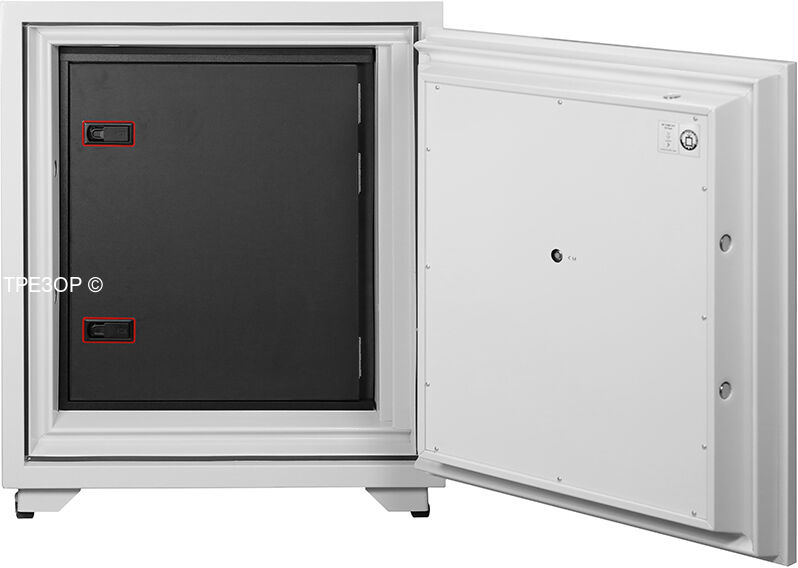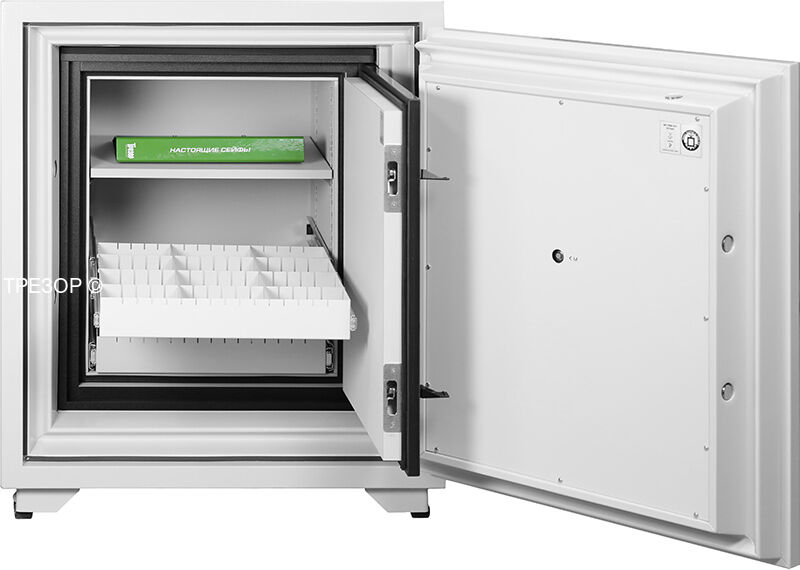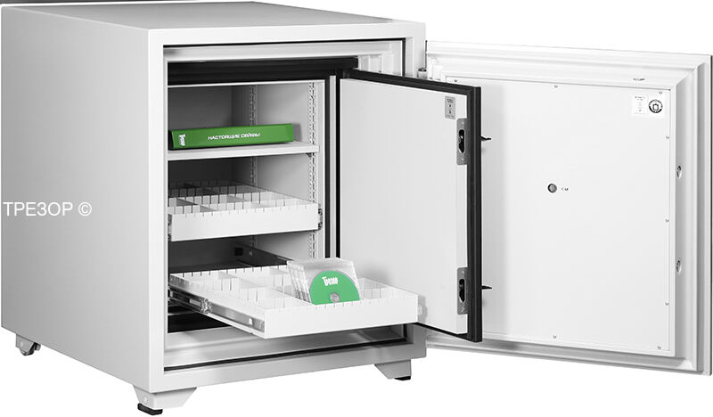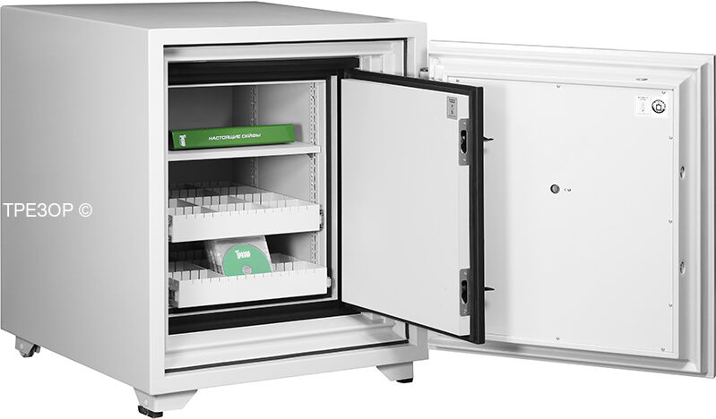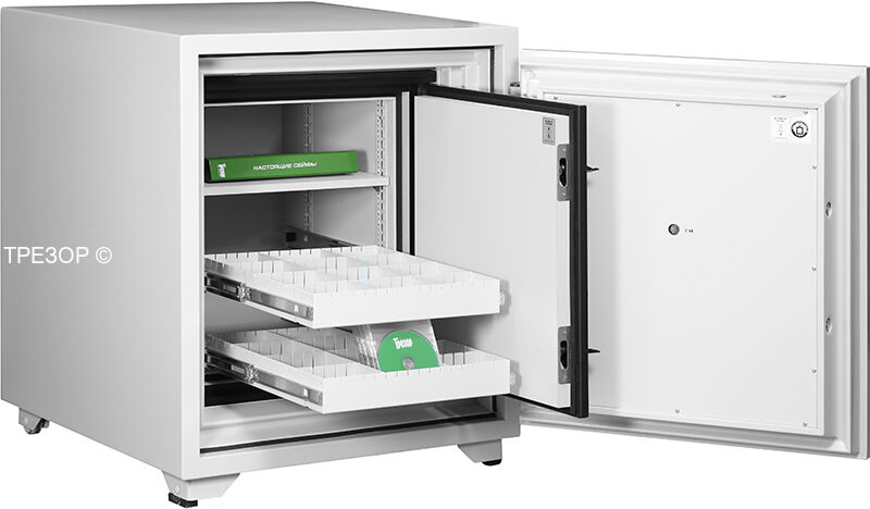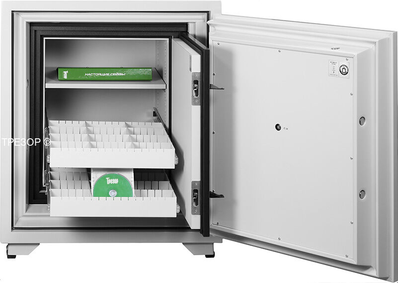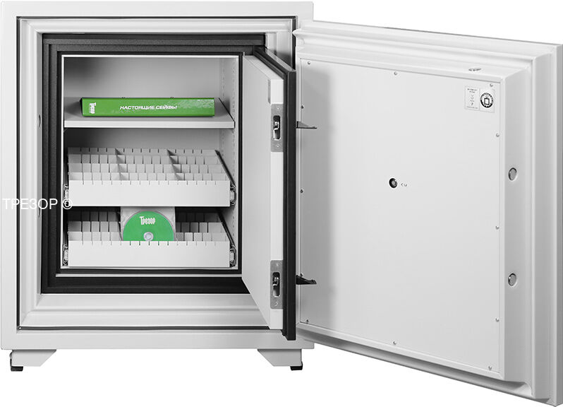 В базовом исполнении модель оснащается 2 универсальными выдвигающимися ящиками и одной полкой. Сейф может быть заказан пустым, без ящиков и полок - индекс этой модификации - DE. Вмещает (по информации производителя) до 580 DAT или 282 CD или 171 LTO. В одном ящике умещается 36 – 45 LTO картриджей в упаковке (см. фото). Рекомендуем купить для хранения резервных копий данных с серверов небольшого предприятия. Пустая или с оснащённая только полками версия отлично подойдёт для хранения неформатных информационных материалов типа рентгенограмм или томограмм, фото и кино плёнок.